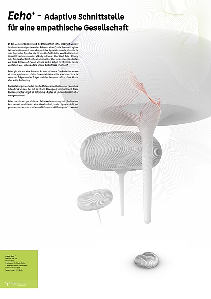 Die Masterarbeit Echo⁺ von Tung Son Tran untersucht, wie gesundheitliche Informationen im öffentlichen Raum sichtbar und verständlich gemacht werden können. Aus einer systemischen Perspektive wird erforscht, wie stille, oft übersehene Signale zwischen Menschen erkannt, gedeutet und in Handlungen übersetzt werden können.